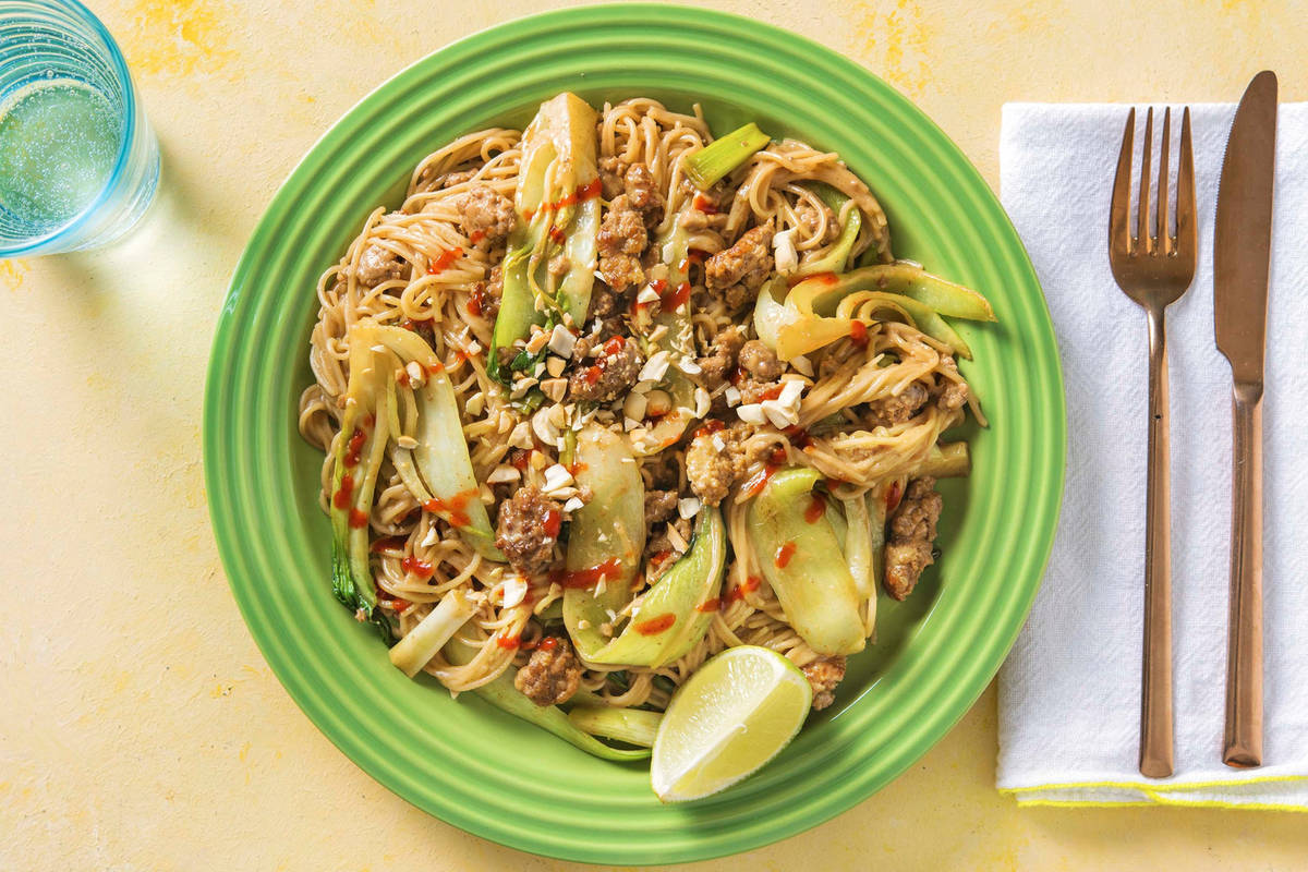 Gemüse und Hackfleisch mit der vorbereiteten Soße ablöschen, alles gut verrühren und einmal aufkochen lassen, bis das Gemüse weich ist. Soße mit Saft von 1 [2 | 2] Limettenspalten abschmecken. Somen-Nudeln unter das Gemüse heben und alles gut vermengen. Mit Salz* und Pfeffer* abschmecken. Somen-Gemüse-Pfanne auf tiefen Tellern anrichten, mit Erdnüssen garnieren und mit Sriracha toppen (Achtung: scharf!). Mit restlichen Limettenspalten genießen.
