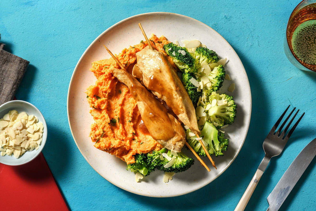 Süsskartoffel-Stock, Spiessli, Sauce und Broccoli auf Tellern verteilen. Broccoli mit Mandelblättchen bestreuen und geniessen. En Guete!