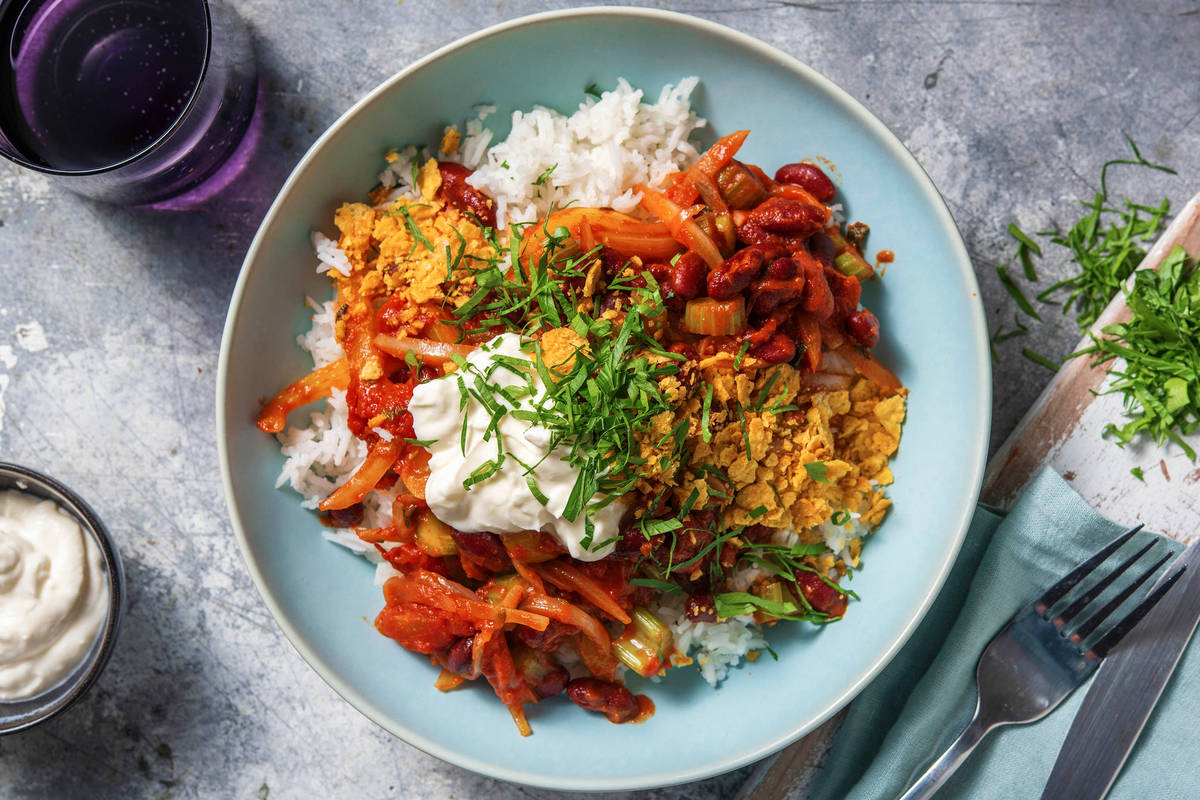 Ein Gericht mit echtem Wohlfühl-Potential: Unsere Bohnenpfanne kommt mit roten Kidneybohnen und knackigem Paprika. Für das gewisse Extra sorgt leichter Basmatireis mit Thymiannote und zerbröselte Tortillas als Topping.