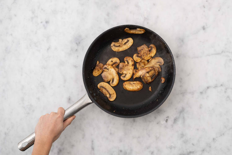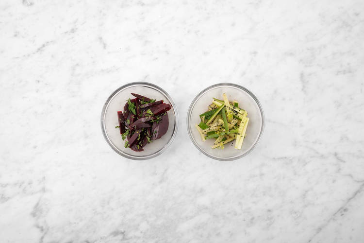 Basmati-Wildreis auf Bowls oder tiefe Teller verteilen. Portobellopilze mit Teriyakisoße, Rote Bete Sticks, Gurkensticks und Avocado darauf anrichten. Avocado mit Koriander bestreuen und Reis mit Sweet-Chili-Soße toppen.