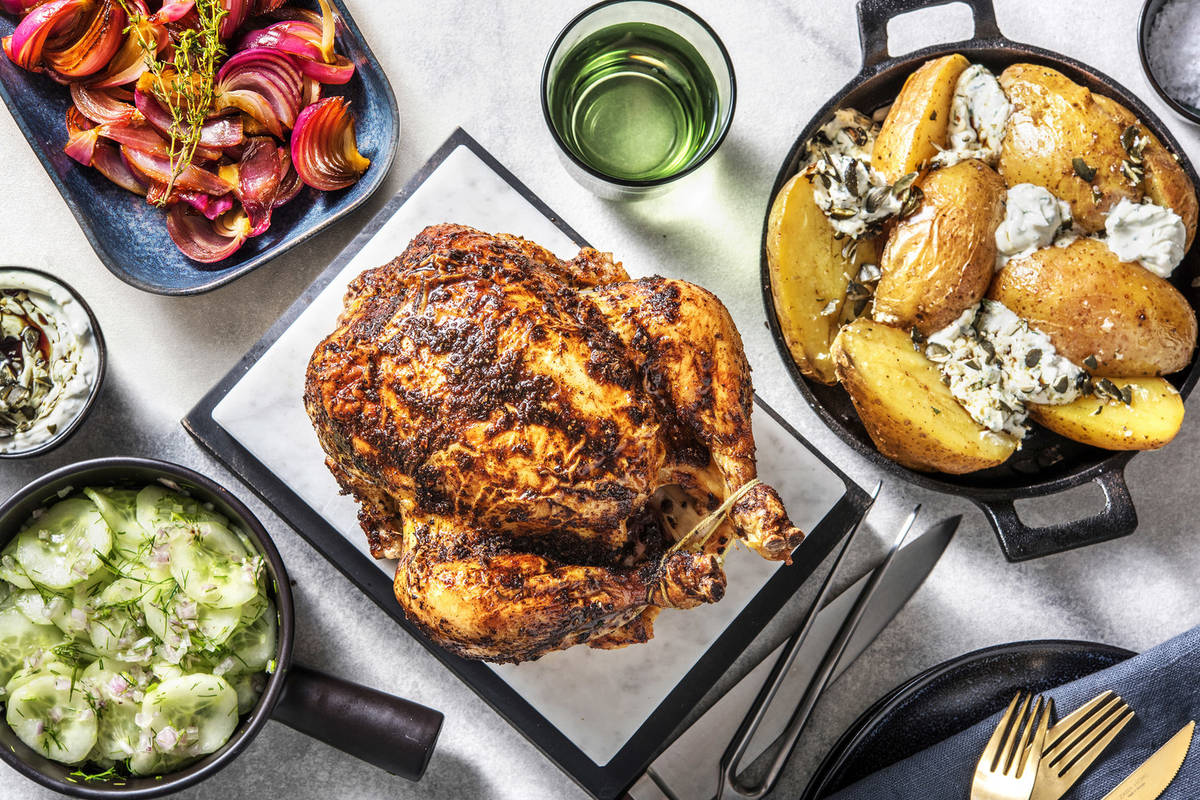 Hähnchen mit Marinade einreiben und für 60 Min. [70 Min. | 70 Min.] backen. Anschließend Hähnchen mit Alufolie abdecken und Temperatur auf 200 °C erhöhen und weitere 30 Min. backen, bis das Fleisch nicht mehr rosa ist. Kartoffeln herausnehmen und Folie vom Hähnchen nehmen. Hähnchen unter dem Grill 1 – 2 Min. backen, bis die Hähnchenhaut goldbraun und knusprig ist. (Achtung: Das geht ganz schnell, immer ein Auge aufs Hähnchen haben!)