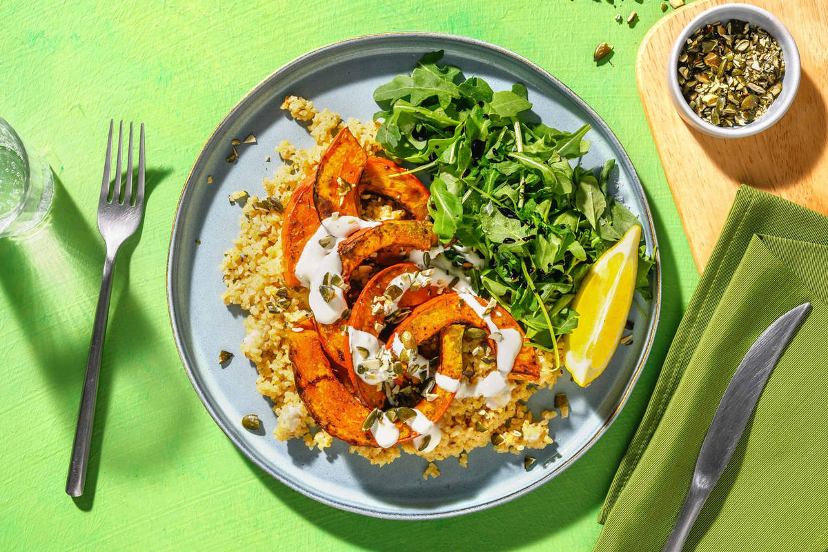 Bulgur auf Teller verteilen, Kürbisspalten darauf anrichten, mit restlichem Joghurt-Dip und Kürbiskernen toppen. Rucolasalat um den Bulgur herum verteilen und alles mit den restlichen Zitronenvierteln geniessen. En Guete!