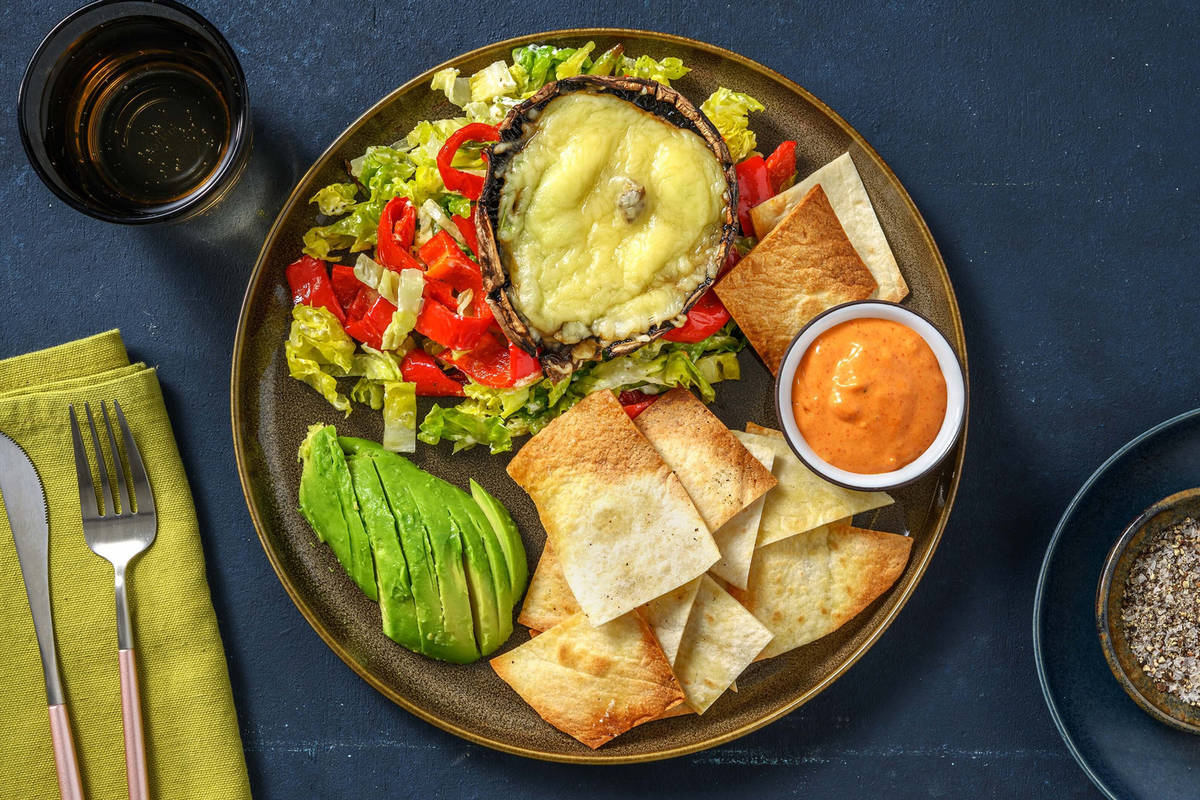 Avocado halbieren, Stein entfernen, Fruchtfleisch herauslösen und in Streifen schneiden. Gebackene Spitzpeperoni mit dem Salat mischen und auf Teller verteilen. Portobello darauf setzen, Avocado und Tortilla-Chips darum verteilen. Mit Chipotle-Dip geniessen. En Guete!