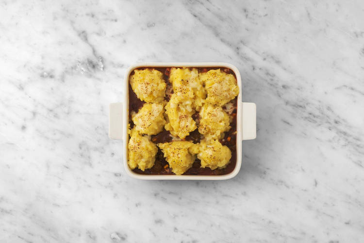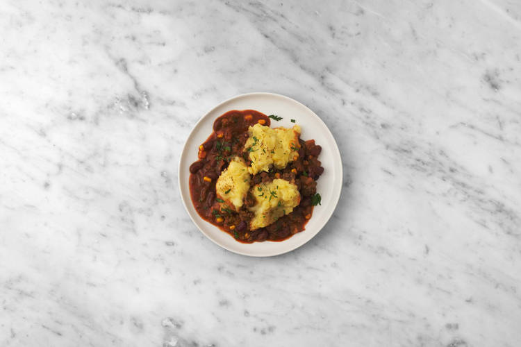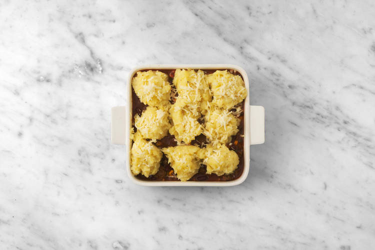 Käsige Kartoffelhügelchen auf würziger Bohnen-Mais-Füllung