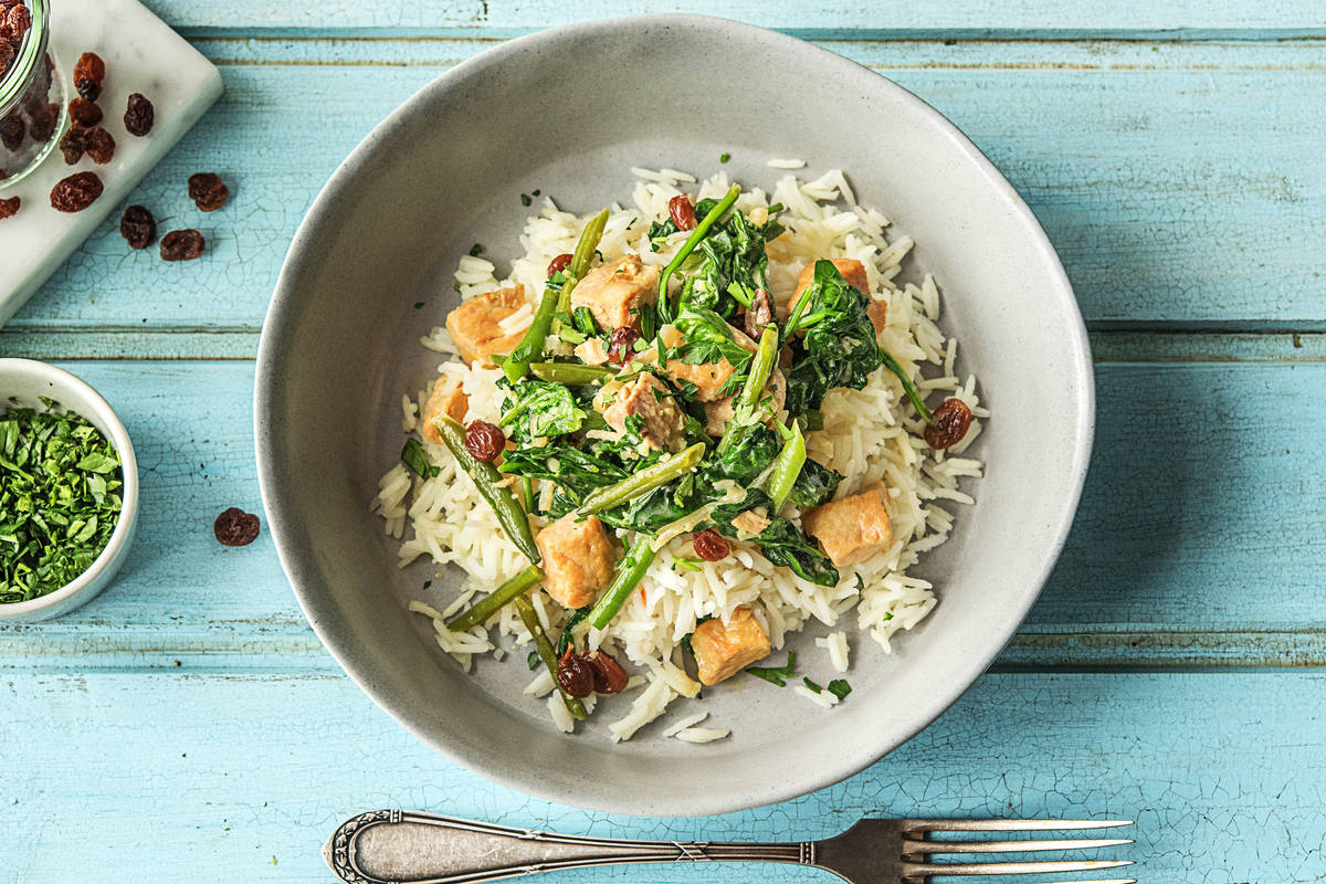 CURRY ZUBEREITEN 300 ml [600 ml] heisse Gemüsebouillon zubereiten und zu den Pouletstreifen in die Bratpfanne geben. Mandeln, Sultaninen, Honig und Kokosmilch dazugeben. Alles verrühren und einmal aufkochen lassen. Dann bei niedriger Hitze ca. 5 Min. weiterköcheln lassen. Gedrittelte Bohnen dazugeben und Curry noch 5–7 Minuten weiterköcheln lassen, bis die Bohnen weich sind und das Curry eine gute Konsistenz hat.
