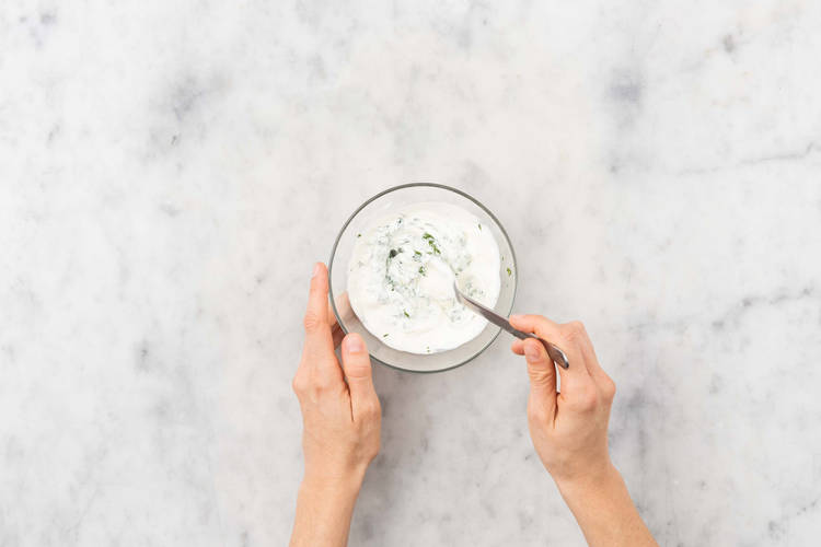 auf Minz-Brokkoli-Reis mit Koriander-Dip
