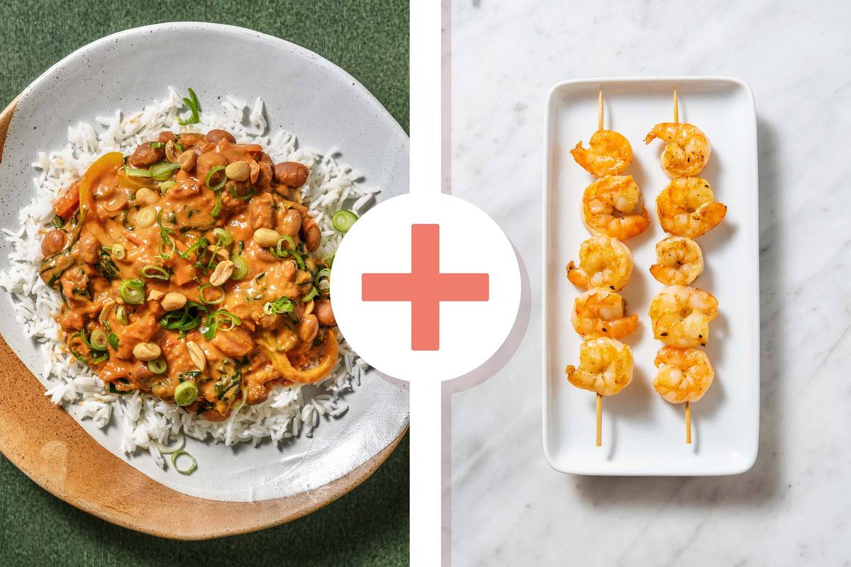 In einer großen Pfanne 1 EL [1,5 EL | 2 EL] Öl* erhitzen und Garnelenspieße darin ca. 3 – 5 Min. je Seite anbraten, bis diese nicht mehr glasig sind. Währenddessen Gemüse aus dem Varoma und Spinat in den Topf zur Soße geben, unterheben und weitere 2 – 3 Min. köcheln lassen. Eintopf mit geräuchertem Paprikapulver, Salz* und Pfeffer* abschmecken. Tipp: Falls der Eintopf zu dickflüssig wirkt, füge etwas Garflüssigkeit hinzu. Erdnüsse grob hacken.