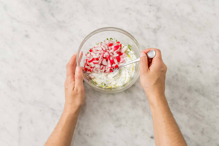 dazu Honig-Senf-Gemüse und Dill-Kartoffelpüree