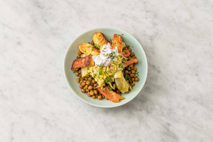 Grillkäse auf Kichererbsen-Spinat-Bett