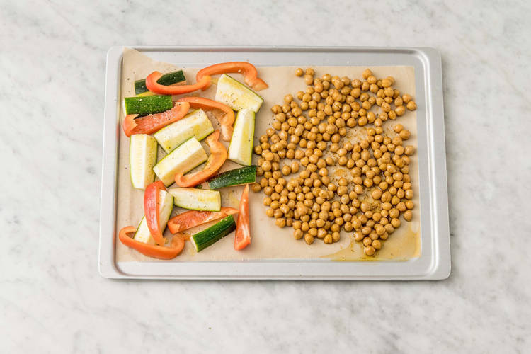 Frische Salat-Bowl mit gerösteten Kichererbsen und Ofengemüse