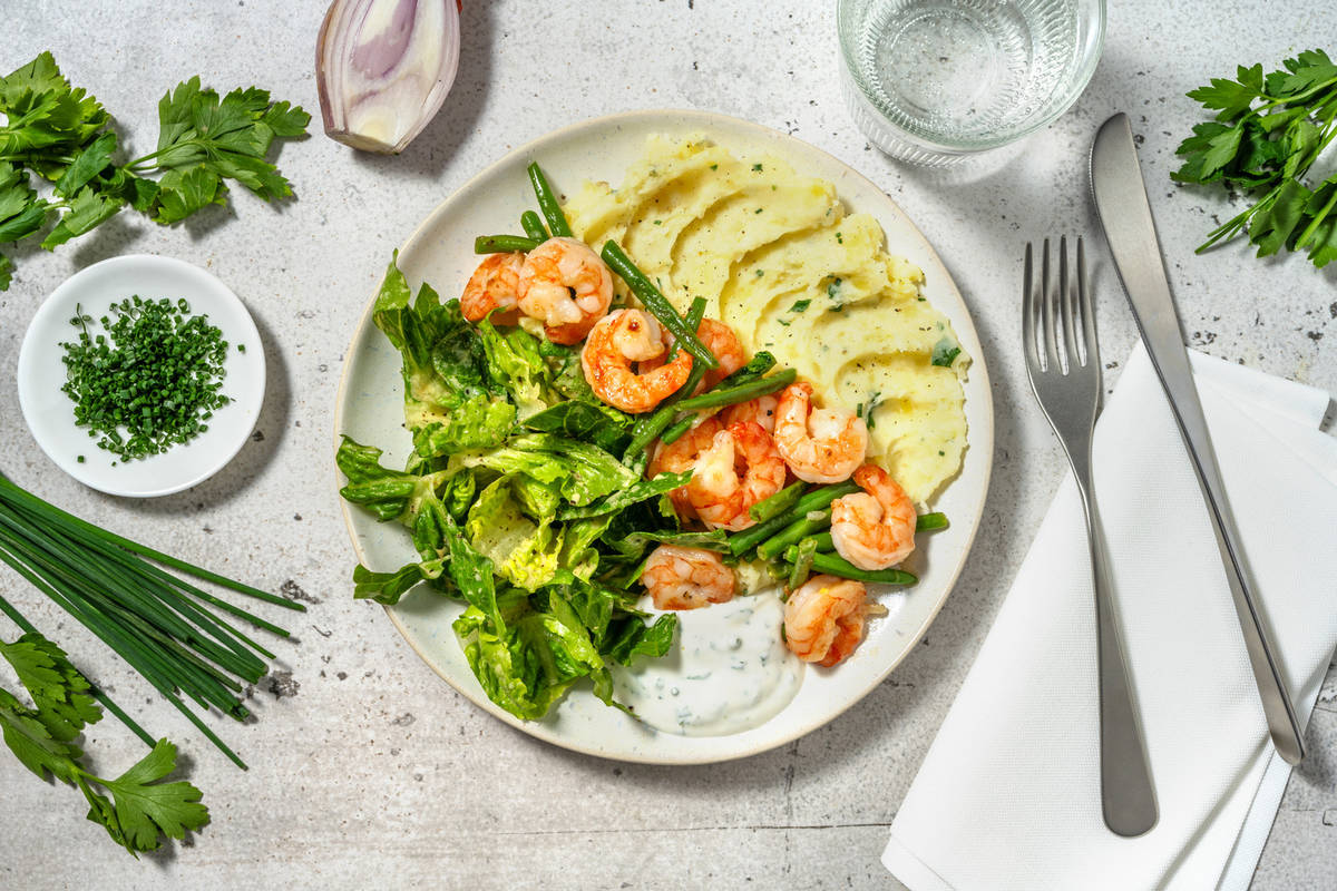 Salat mit dem Dressing vermengen. Kartoffel-Rüebli-Stock auf Teller verteilen, Crevetten darauf anrichten und mit dem Joghurt toppen. Salat daneben anrichten und geniessen.