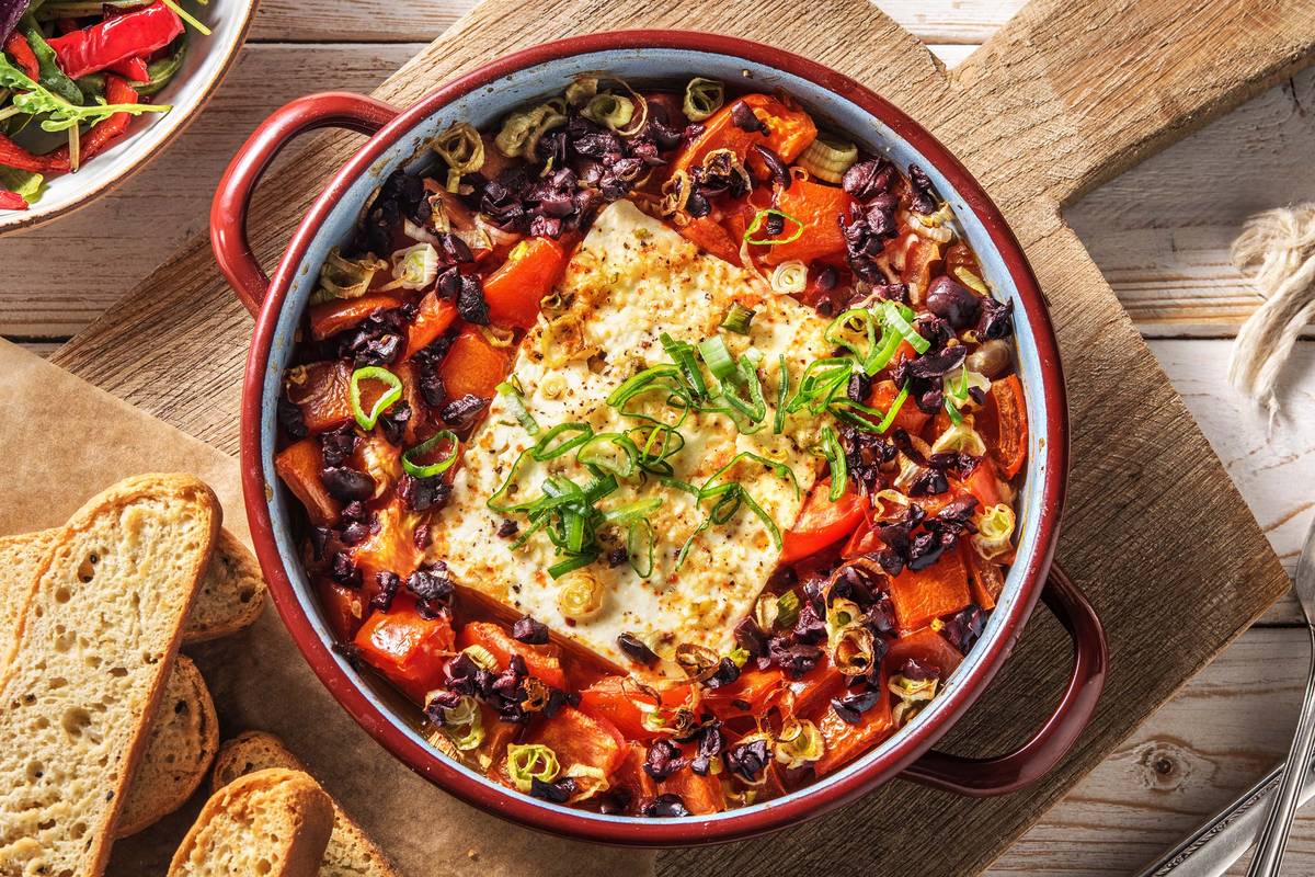 Einfacher geht es nicht! Denn für unser heutiges Gericht brauchst Du lediglich ein wenig zu schnippeln und ein Dressing anzurühren – den Rest erledigt Dein Backofen! Was dann schlussendlich auf dem Tisch steht, ist bekannt in der griechischen Küche: Gebackener Schafskäse mit Tomaten-Zwiebel-Gemüse und original Kalamata-Oliven. Dazu gibt es ein warmes, knuspriges Knoblauch-Fladenbrot und einen frischen Salat. So schnell und einfach kann schon einmal Urlaub auf dem Tisch stehen!