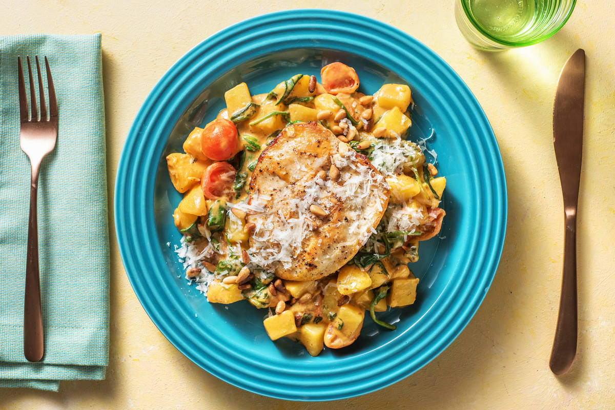 Rahm-Kartoffel-Gemüse auf Teller geben und gebratene Hähnchenbrust darauf anrichten. Mit Hartkäse und Pinienkernen toppen und genießen.