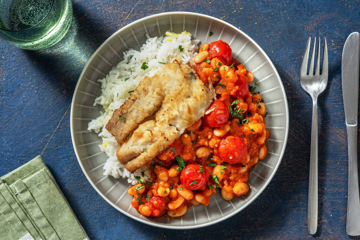 Fischfilets, Bohnengemüse und Reis auf Tellern anrichten. Mit gehackter Petersilie bestreuen und genießen.