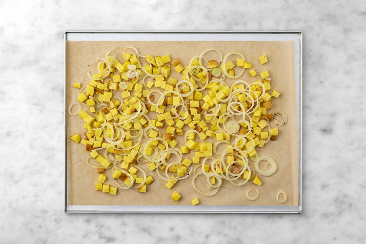 mit knusprigen Kartoffelwürfeln und grünen Bohnen