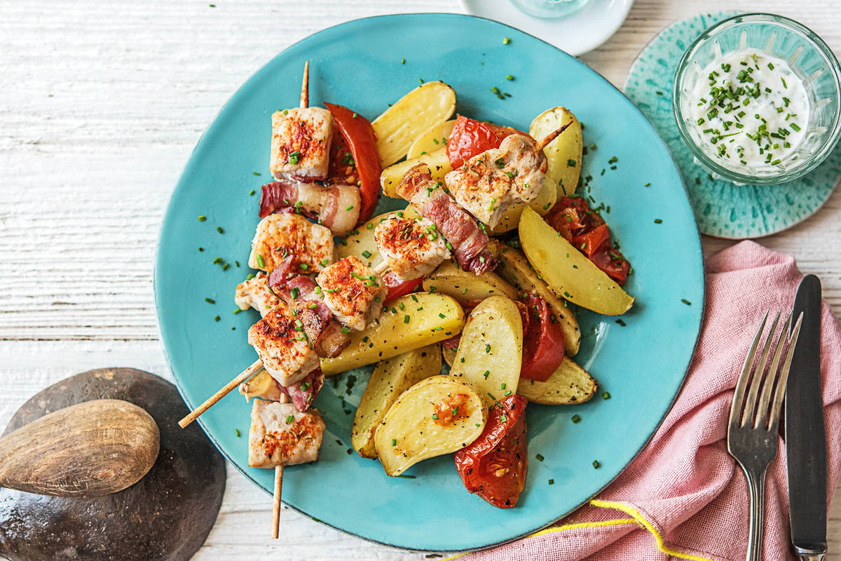 GYROS-SPIESSLI VORBEREITEN Frühstücksspeck locker aufrollen und abwechselnd mit Fleischwürfeln auf Holzspiessli stecken. Diese für die letzten 10–15 Min. der Kartoffelgarzeit mit in den Backofen geben und garen.