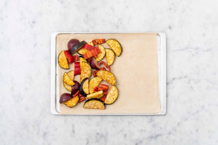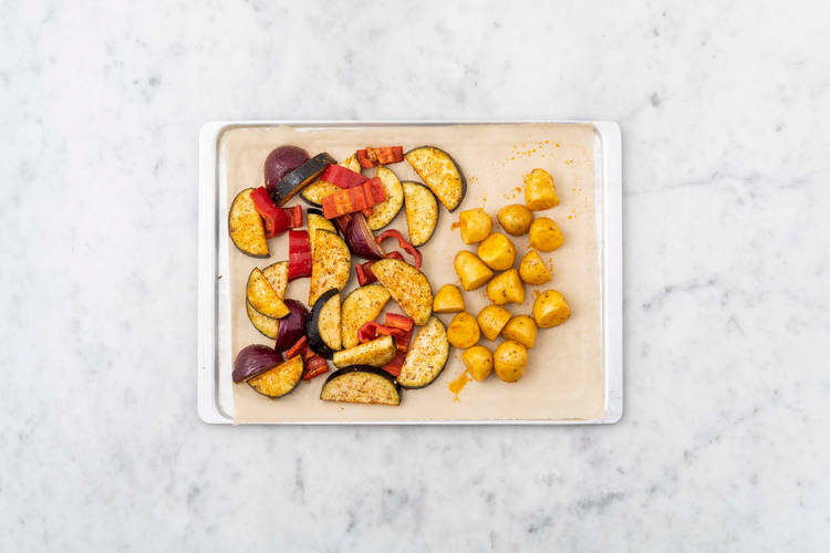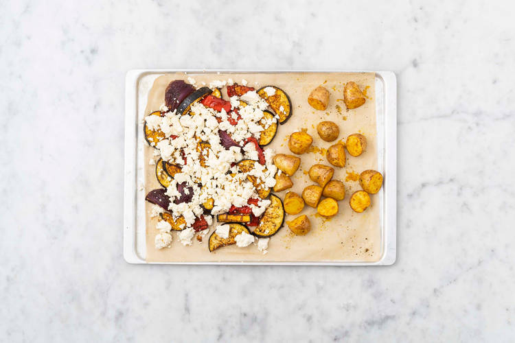 Etwas Ajvar-Dip auf den Tortillas verteilen, dabei mindestens 2 cm am Rand frei lassen. Ofengemüse mit Hirtenkäse auf dem unteren Drittel verteilen, dann die Seiten der Tortillas links und rechts nach innen klappen. Nun die untere Seite nach oben über die Füllung klappen und fest aufrollen. Drillinge und restlichen Ajvar-Dip und Aioli dazureichen. Guten Appetit!
