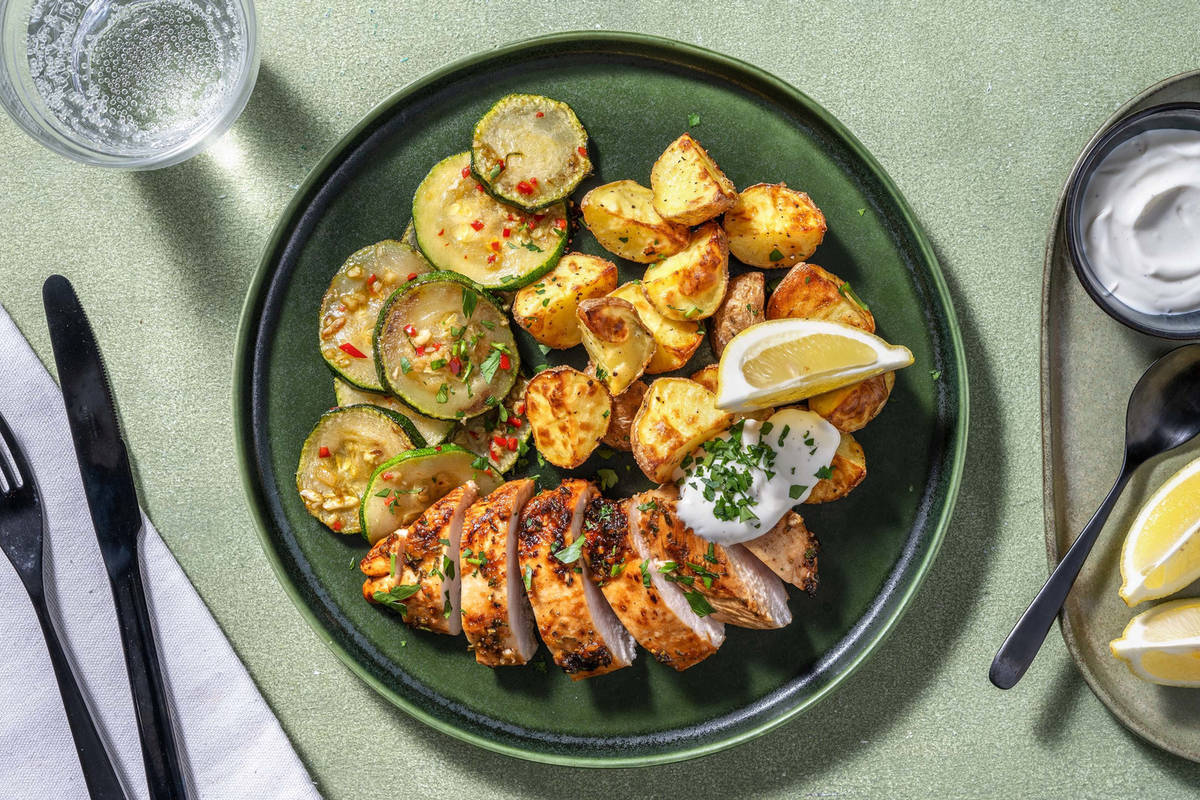 Pouletbrust und Kartoffelspalten auf Teller verteilen, Zucchettigemüse dazu anrichten und zusammen mit einem Klecks Crème fraîche und restlichen Zitronenspalten geniessen. En Guete!