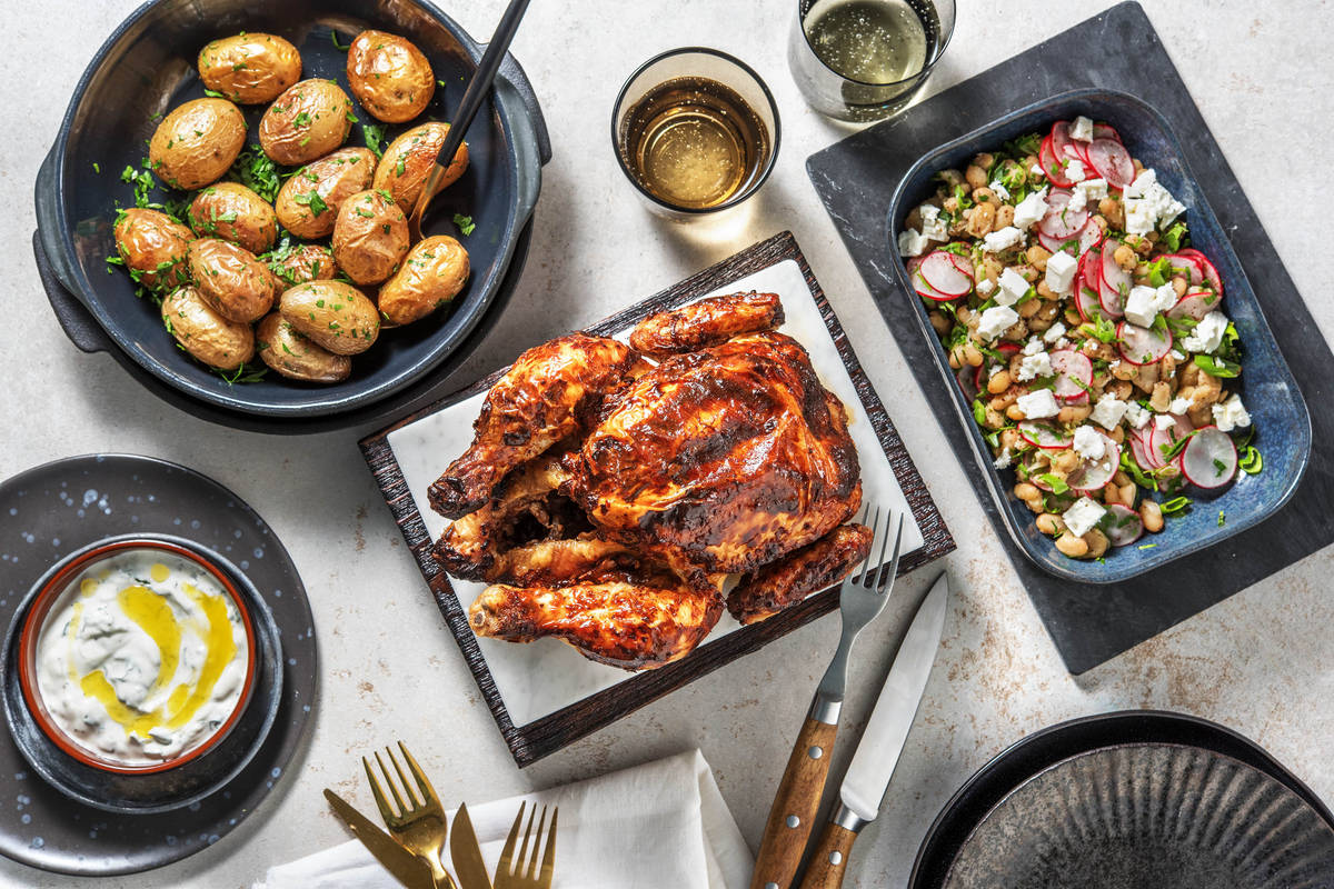 Du wolltest schon immer ein ganzes Hähnchen zubereiten? Dann kommt unser Meisterstück genau richtig! Denn heute marinierst Du ein zartes Hähnchen mit einer herrlichen Harissa-Joghurt-Marinade und lässt es anschließend im Backofen fertig garen. Einfach, oder? Während der Garzeit kümmerst Du Dich um köstliche Beilagen: Minzjoghurt, klassische Salzkartoffeln und einen Hirtenkäse-Bohnen-Salat. Komplimente gibt es für dieses Essen garantiert!