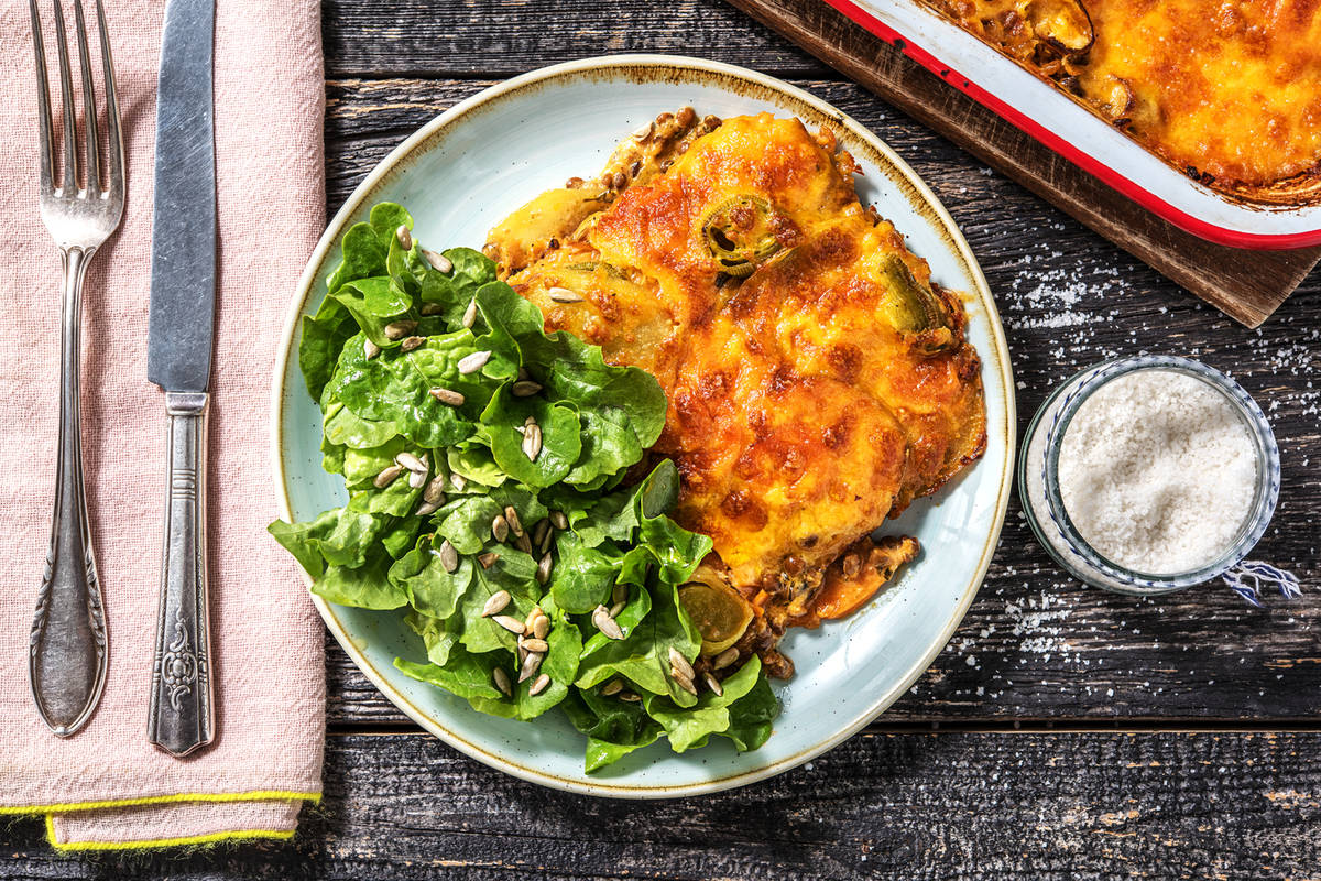 Die Hälfte des Gemüses in eine kleine Auflaufform geben. Die Hälfte vom Rahm-Mix dazugiessen und mit Linsengemüse toppen. Ofengemüse daraufgeben, restlichem Rahm darübergiessen und im Ofen ca. 30 Min. backen. 5 Min. vor Ende der Backzeit Käse-Mix über den Auflauf streuen und zu Ende backen, bis der Käse geschmolzen ist.