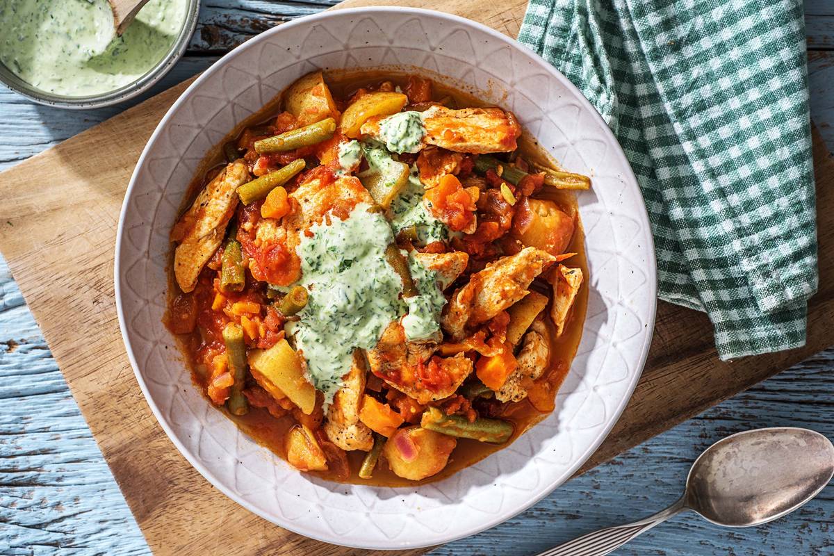 Die perfekte Mischung aus cremig-herzhaft und frisch-würzig gibt es heute. Denn unser Hähncheneintopf bringt alles mit: Wohlfühlfaktoren wie Schmand mit Kräutern und gebackene Kartoffeln. Andererseits aber auch frische Zutaten wie Buschbohnen oder die aromatischen, stückigen Tomaten, die Dich an den Sommer erinnern sollen. Übrigens ist unser Rezept echt praktisch, denn Du benötigst lediglich einen großen Topf und Deinen Backofen dafür. En Guete!