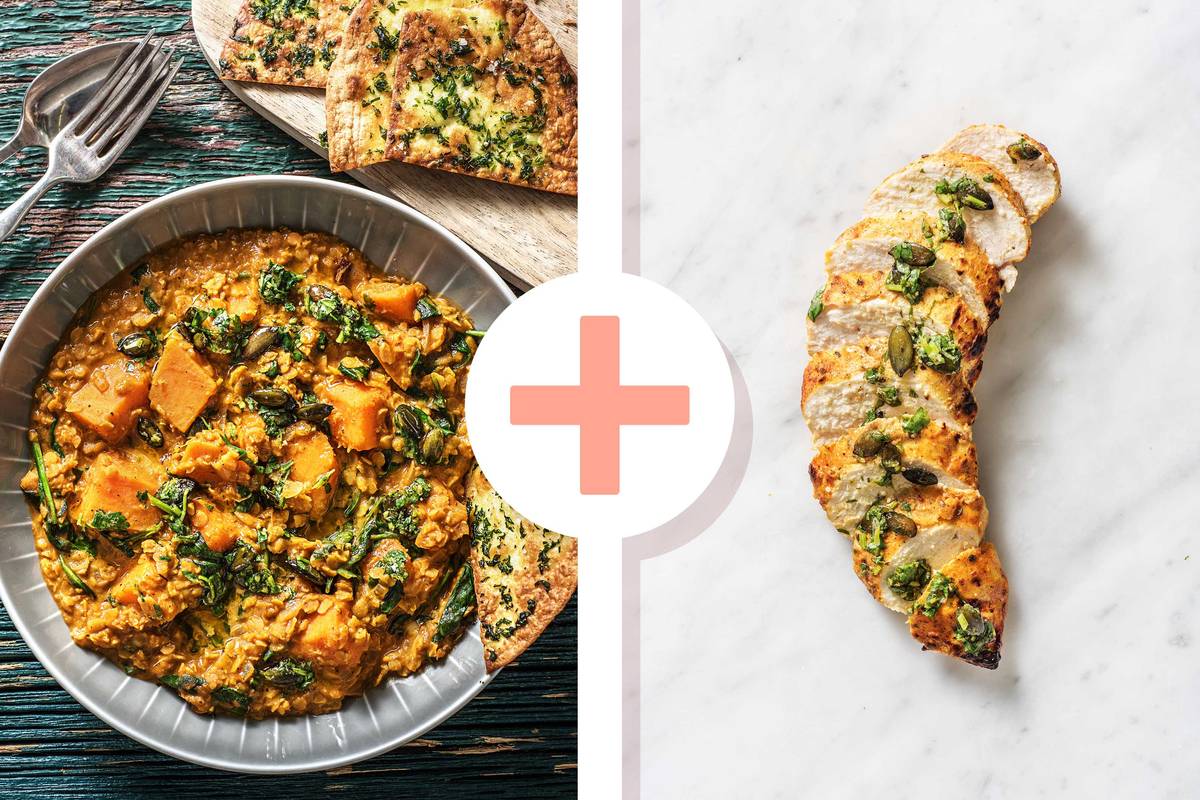 Hello Extra! Dein indisches Dahl mit Süßkartoffel und Kokos erfährt heute ein Upgrade durch Hähnchenbrustfilets in einer leckeren Joghurtmarinade mit Garam Masala. Dein Dahl enthält außerdem dank der Süßkartoffel zusätzliche Mineralien und Ballaststoffe. Und den besonderen Dreh erhältst Du durch die Kombination mit frischer Limettensalsa und knusprigen Korianderchips. Guten Appetit!
