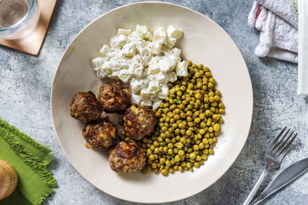Buttererbsen auf Teller verteilen. Hackbällchen und Rahmkohlrabi daneben anrichten und genießen.
