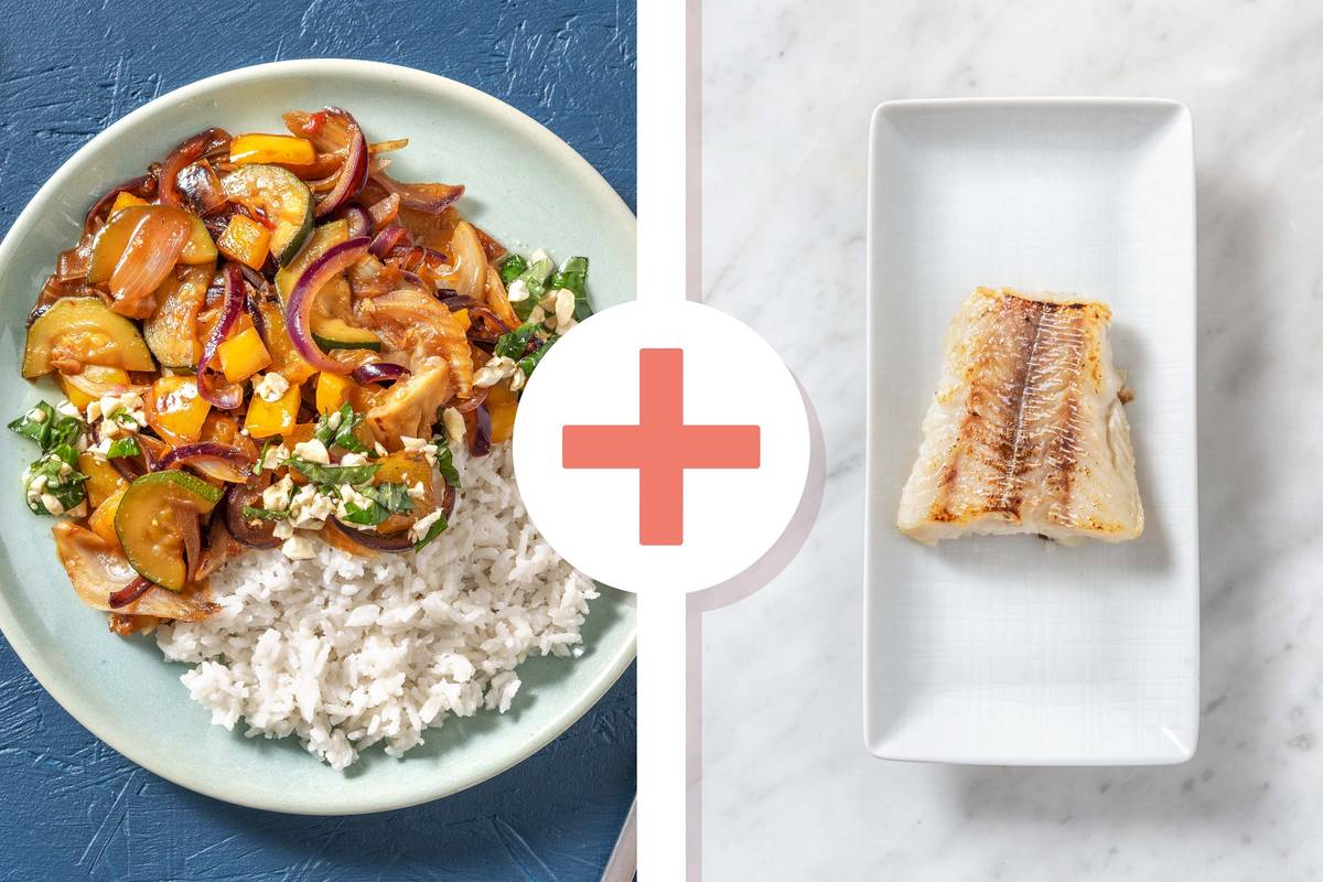 Jasminreis nach der Quellzeit mit einer Gabel auflockern und auf Teller verteilen. Gemüsepfanne darauf anrichten, mit gehackten Cashewkernen und restlichem Thai-Basilikum bestreuen und genießen. Guten Appetit!