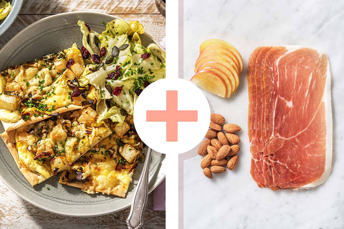 Dank unseres Extra Leckerbissens genießt Du heute einen ganz besonderen Flammkuchen: Getoppt mit Prosciutto, Rauchmandeln und Apfelstückchen – da kann niemand widerstehen! Perfekt dazu passt der kräftige Gratinkäse. Einen ganz besonderen Salat gibt es auch, der Dich mit fruchtigen Cranberrys und nussigen Kürbiskernen bestimmt genauso begeistert wie uns. Schnell zubereitet, raffiniert und so lecker!