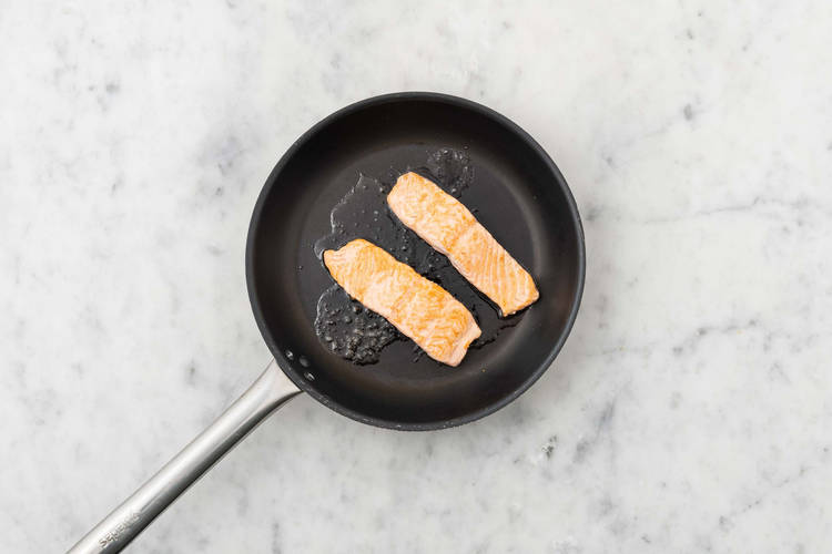 In einer grossen Bratfanne Mandelblättchen für 1 – 2 Min. rösten und wieder aus der Bratpfanne nehmen. In der Bratpfanne 1 EL [2 EL] Öl* erhitzen und darin Lachs auf der Hautseite bei hoher Hitze anbraten, dann Hitze reduzieren und Lachs für 2 – 3 Min. bei mittelhoher Hitze weiterbraten. Filets vorsichtig wenden und 2 – 3 Min. auf der anderen Seite weiterbraten, bis diese innen nicht mehr glasig sind.