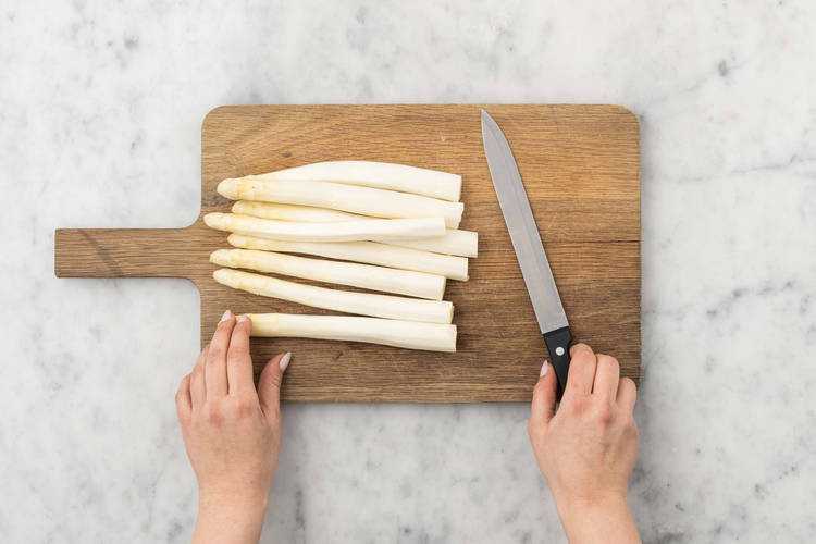 Zwei Töpfe mit Wasser* füllen, reichlich salzen* und aufkochen lassen. Kartoffeln schälen und vierteln. Eschalotte halbieren und fein hacken. Dill fein hacken. Orange halbieren und Orangensaft in einen Messbecher pressen. Spargel schälen und ca. 1 cm vom unteren Ende abschneiden.