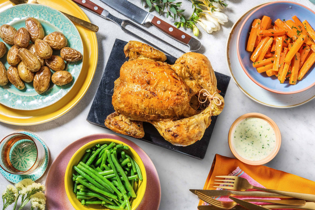 Alles ca. 60 Min. [70 Min. | 70 Min.] im Backofen backen. Anschließend Temperatur auf 200 °C Umluft erhöhen und weitere 20 – 30 Min. backen, bis die Kartoffeln weich sind und das Hähnchen nicht mehr rosa ist. Dann Hähnchen unterm Grill 2 – 3 Min. backen, bis die Hähnchenhaut goldbraun und knusprig ist.