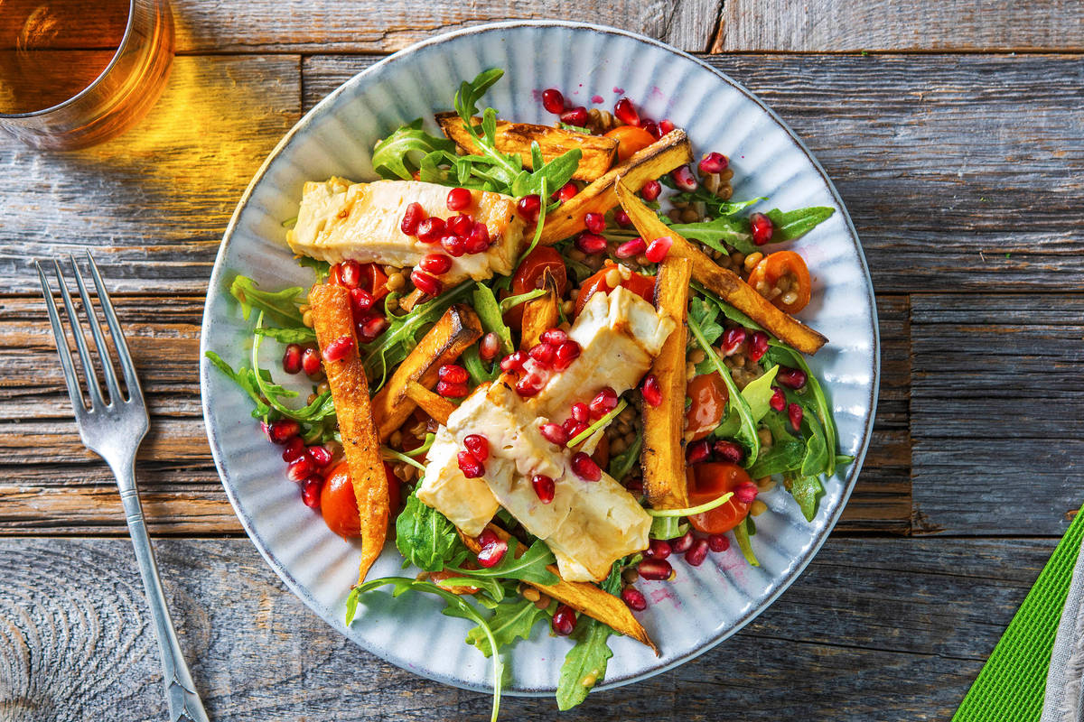 Cherry-Tomaten zu den Linsen geben, Rucola unterheben und auf Teller verteilen. Süsskartoffelspalten und Hirtenkäsescheiben daraufgeben, mit Granatapfelkernen bestreuen und geniessen.