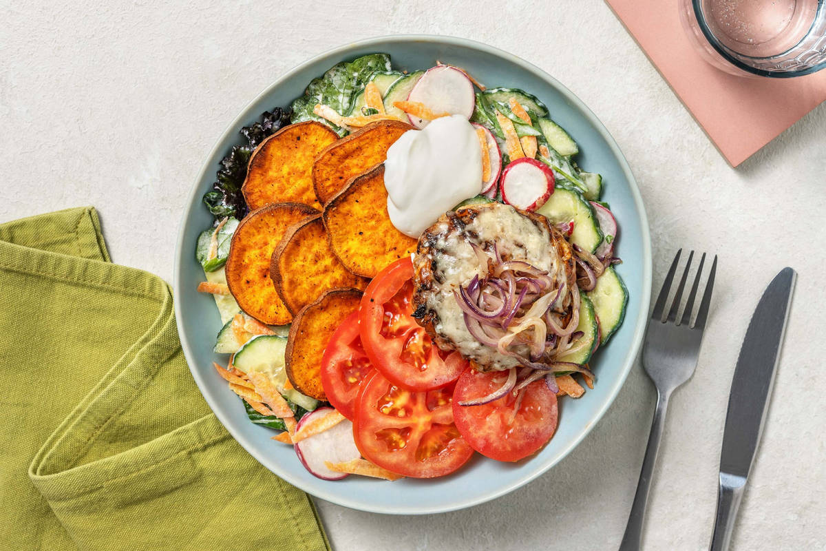 Salat auf Teller verteilen, Süsskartoffeltaler daneben anrichten. Burgerpatties auf den Salat legen, mit Tomatenscheiben und gebratenen Zwiebeln toppen. Dip dazu reichen. En Guete!