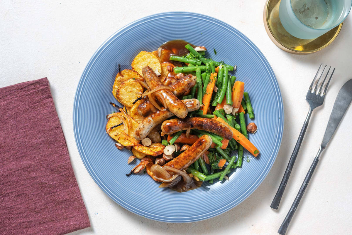 Kartoffeln, Gemüse, Würstchen und Soße auf Tellern anrichten. Gemüse mit gehackten Haselnüssen toppen und genießen.