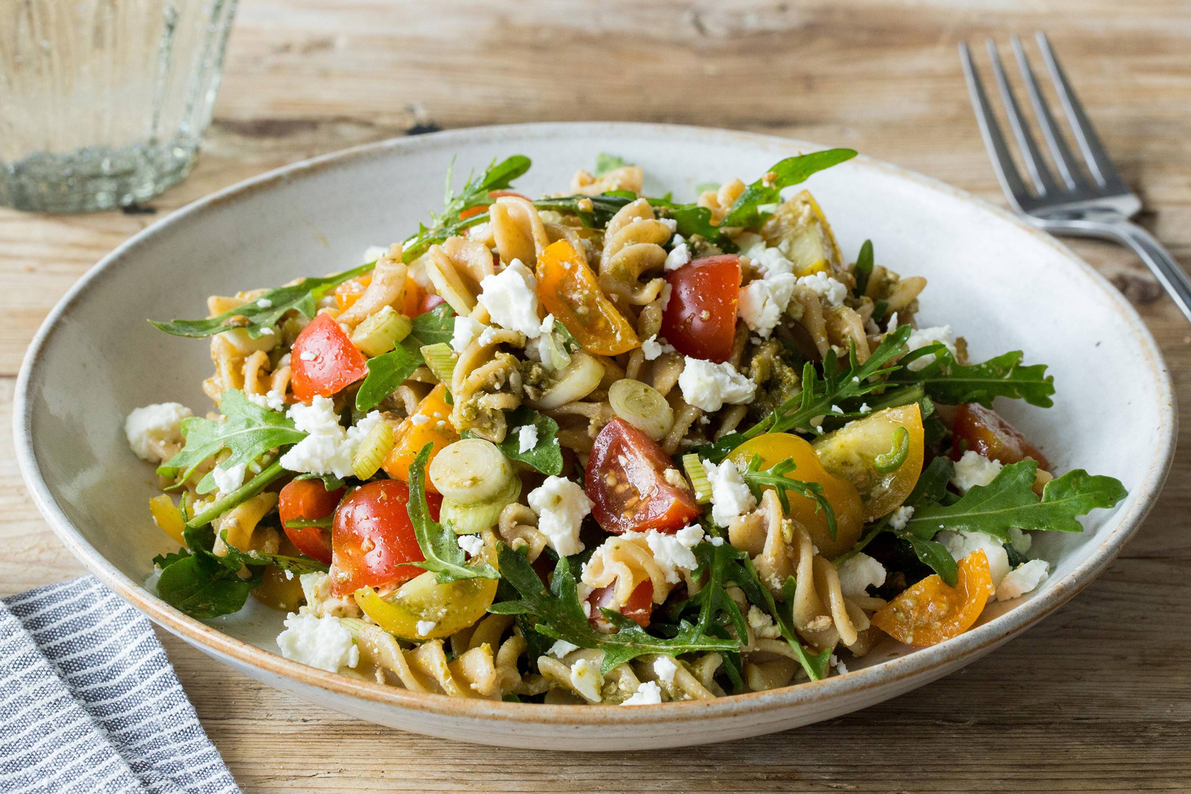 Sauce in die grosse Bratpfanne aus Schritt 3 geben, kurz erhitzen, dann die gekochten Paccheri, restliche Kürbiswürfel und Zwiebelspalten hinzugeben und alles miteinander vermengen. Pasta mit der Sauce auf Tellern verteilen, Salat dazu anrichten und mit Baumnüssen und Salbei toppen. En Guete!