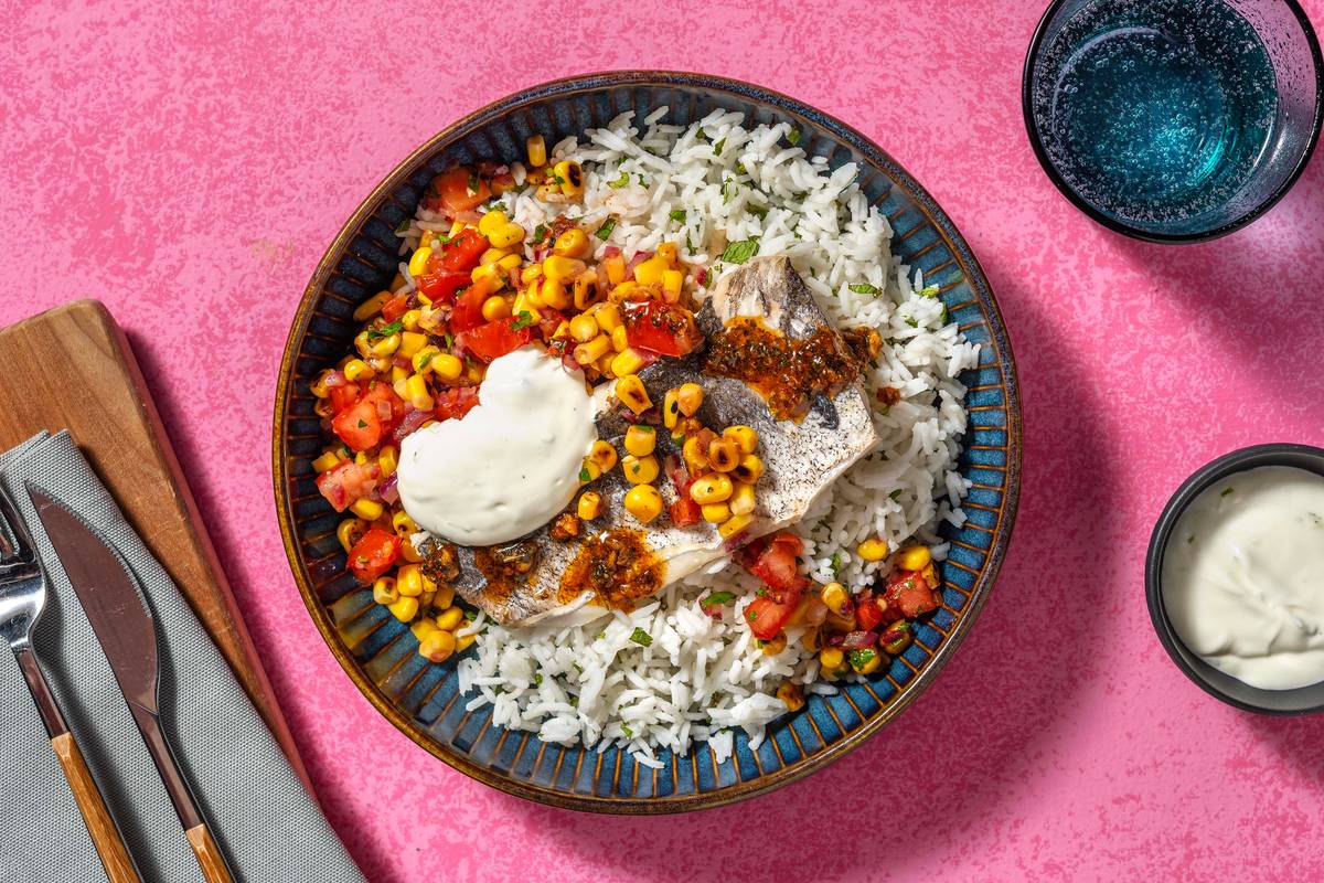 Reis auf tiefe Teller verteilen, Fischfilets und Mais-Salsa daneben anrichten, mit der Piri-Piri Butter toppen und mit dem Limettendip servieren.