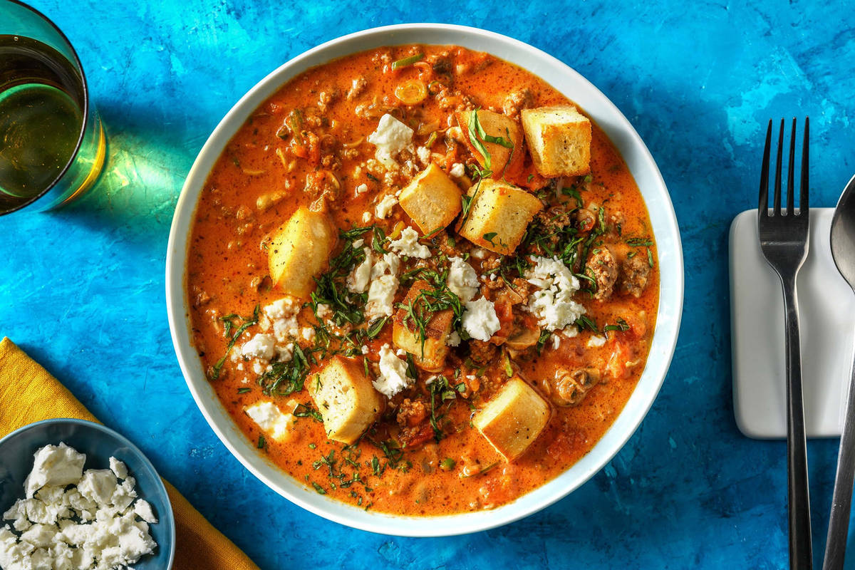 Frühlingszwiebeln zum Hackfleisch geben und 1 Min. mitbraten. Mit stückigen Tomaten und 200 ml [400 ml] heissem Wasser* ablöschen. 4 g [8 g] Gemüsebouillonpulver*, Gewürzmischung „Hello Buon Appetito“ und 1 Prise Zucker* dazugeben und alles 5 Min. köcheln lassen.