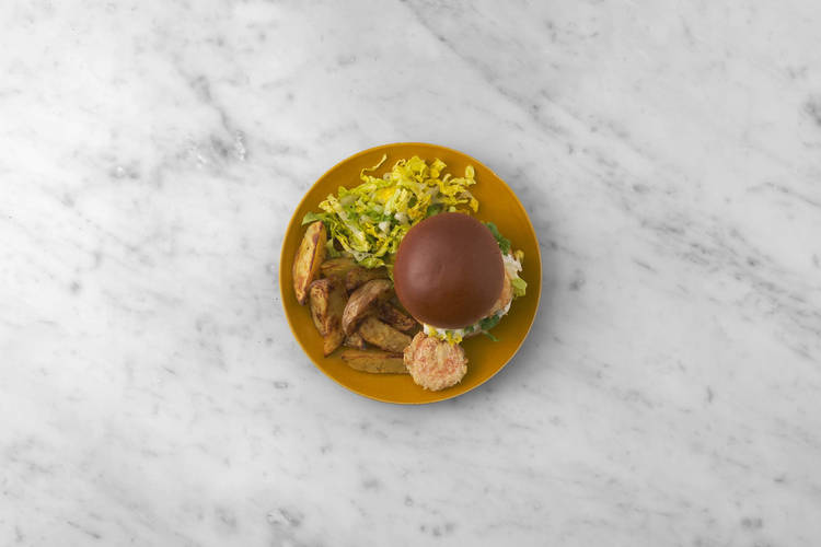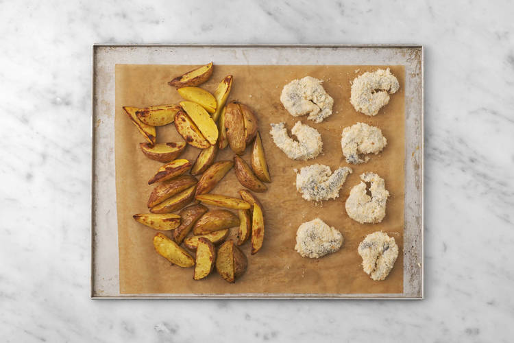 mit Kartoffelspalten und scharfer Mayonnaise
