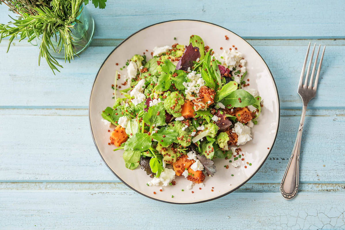 Romanescoröschen und Süsskartoffelwürfel unter die Quinoa mischen. Wildkräutersalat unterheben.