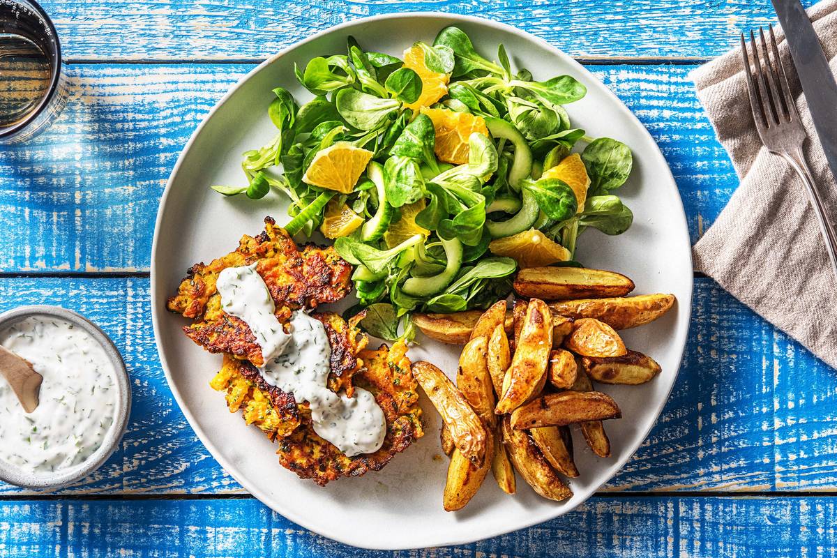 Mit diesem frischen Gericht kannst Du Dich schon mal in den Frühling träumen! Die leckeren Karotten-Haferpuffer bereitest Du im Handumdrehen zu und der Feldsalat holt Dich dank knackigen Gurken und fruchtigen Orangenspalten aus Deinem Winterblues. Mit einem cremigen Korianderdip und Ofenwedges kannst Du es Dir frühlingshaft schmecken lassen!