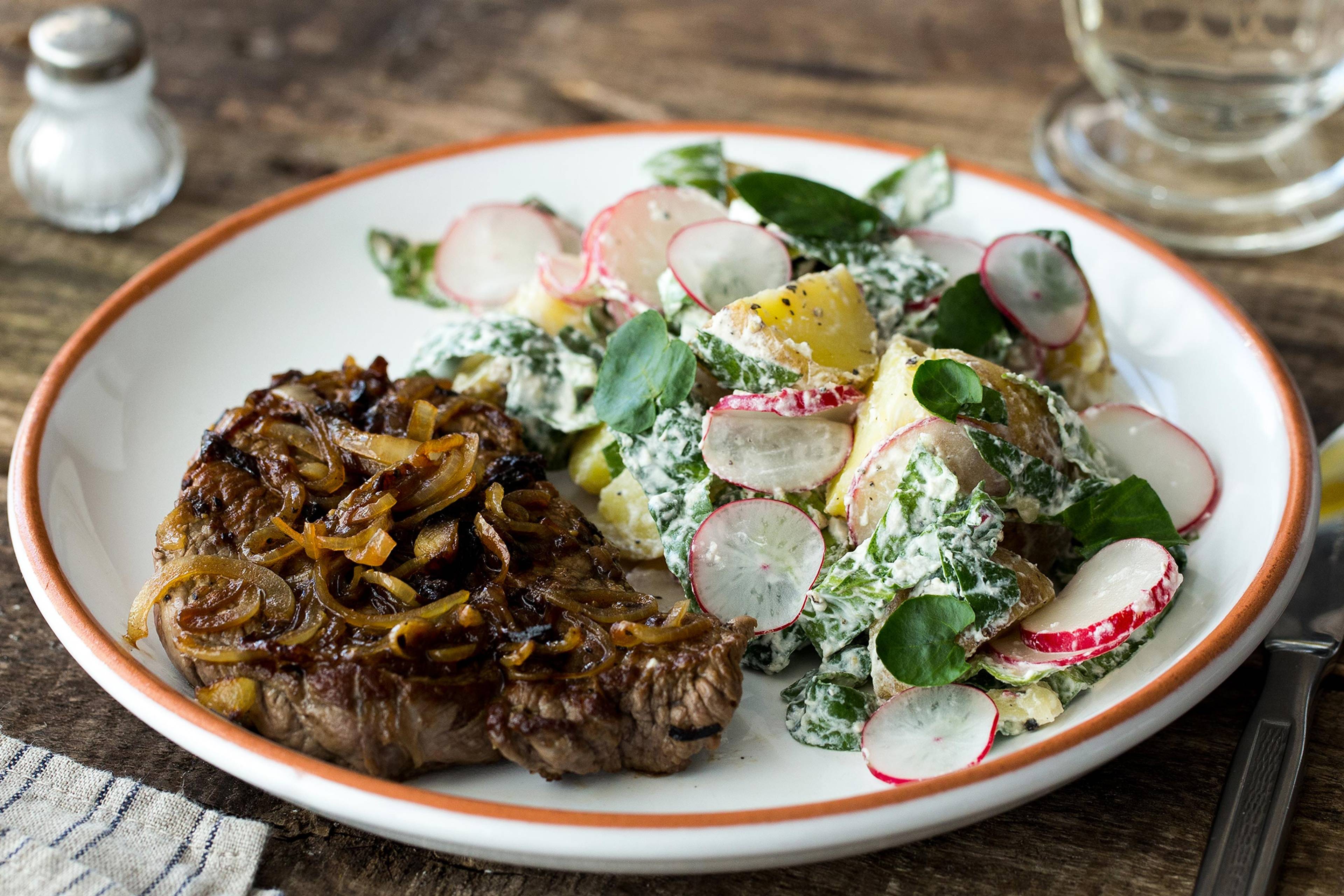 Zitronen-Kartoffeln, Lachs mit Senf-Butter und Radiesli-Gemüse auf Teller anrichten. Radiesli-Gemüse mit etwas saurem Halbrahm-Dip beträufeln und mit dem restlichen Dip geniessen.