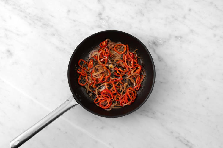 roter Spitzpeperoni, Zucchetti und frischem Basilikum