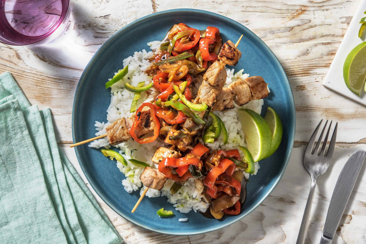 Bratpfanne mit vorbereiteter Sauce ablöschen und 2 – 3 Min. bei mittlerer Hitze köcheln lassen. Spiessli zurück in die Bratpfanne geben, Peperonistreifen aus dem Varoma zugeben und weitere 1 – 2 Min. köcheln lassen, bis das Fleisch leicht rosa und die Sauce ein bisschen eingedickt ist. Sauce mit Limettensaft und Salz* und Pfeffer* abschmecken.