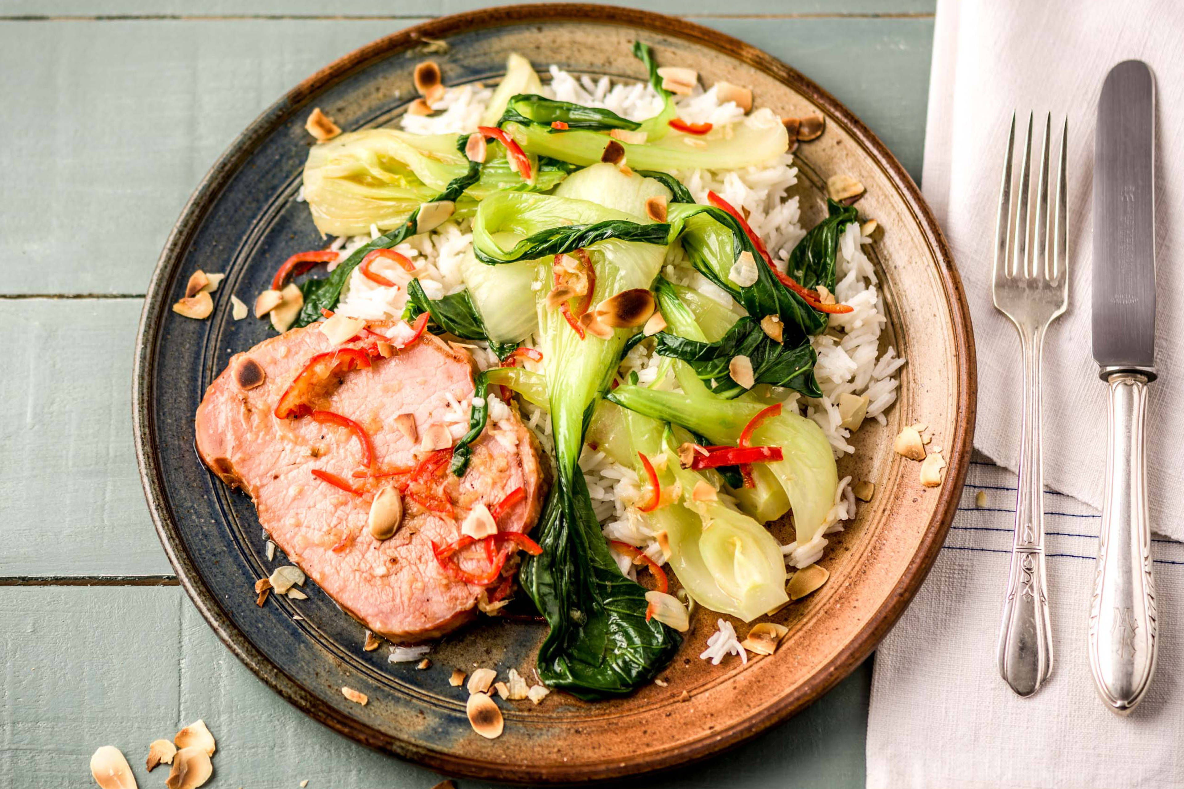 Bratpfanneninhalt mit der vorbereiteten Sauce, Sesam und Getrocknete Aprikosen ablöschen und ca. 1 Min. einköcheln lassen, bis die Sauce eingedickt ist. Mit Salz* und Pfeffer* abschmecken. Reis auf dem Teller verteilen. Süsssaure Bratpfanne darauf geben und geniessen. En Guete!
