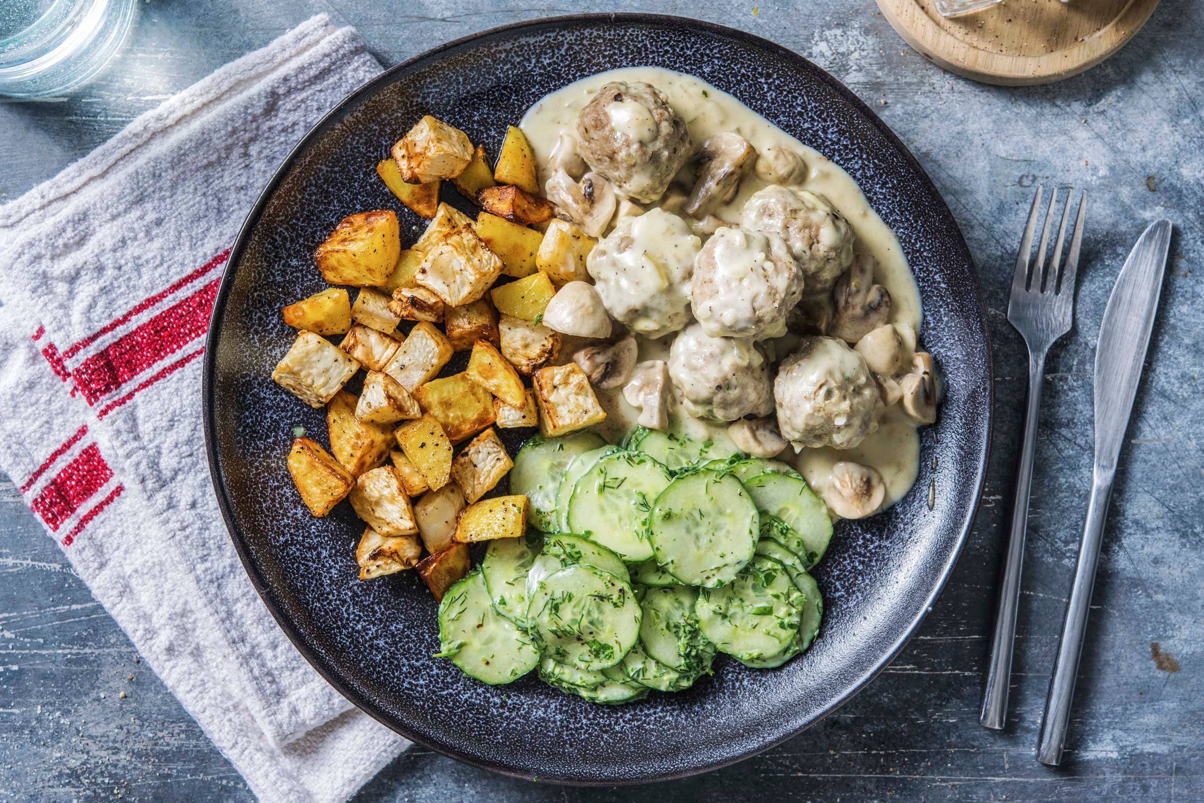 Schweinefiletstücke auf Teller verteilen. Spätzli und Salat daneben anrichten und mit Kräuter-Dip servieren.