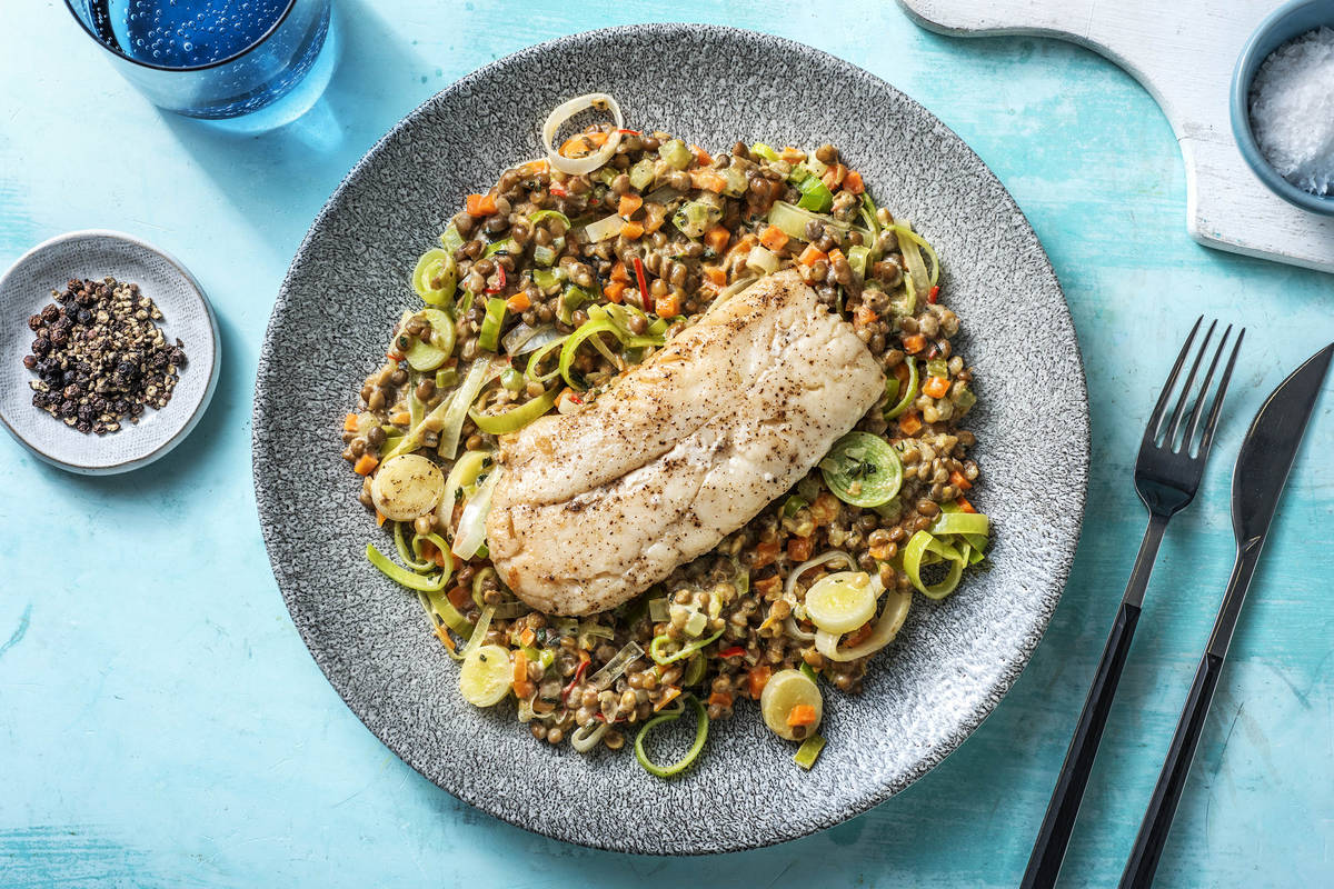 Cremiges Lauch-Linsen-Gemüse auf Teller geben, Seehechtfilets darauf anrichten und geniessen.