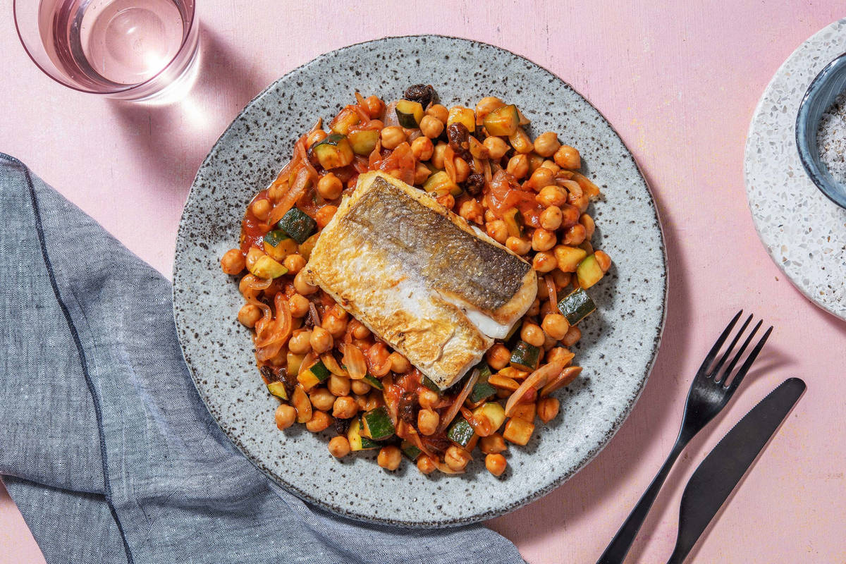 Gemüse mit Kichererbsen samt Flüssigkeit und der Worcestersosse ablöschen. Tomatenmark, Sultaninen und restliche Gewürzmischung dazugeben und einmal aufkochen lassen. Hitze reduzieren und alles abgedeckt 6 – 8 Min. köcheln lassen, bis das Gemüse weich ist. Mit Salz* und Pfeffer* abschmecken.