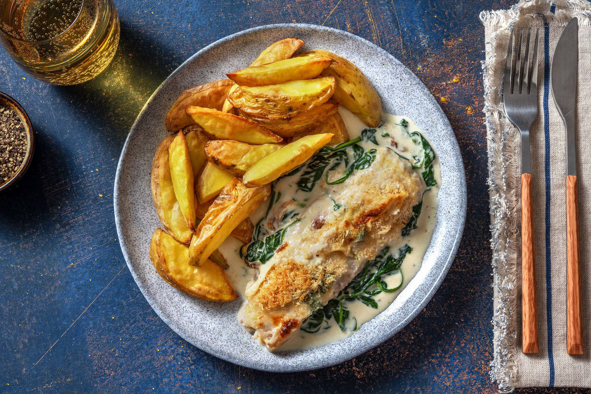Kartoffelspalten auf Teller verteilen, Seehecht mit Spinat-Rahm-Sauce dazu anrichten und geniessen. En Guete!