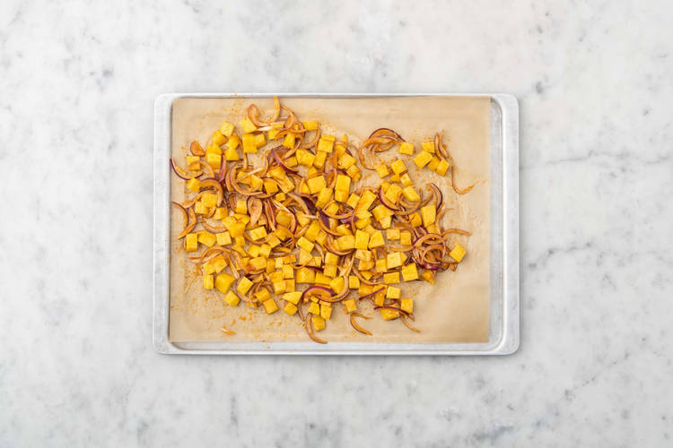 In einer grossen Schüssel Kartoffeln und Zwiebel mit 1 EL [2 EL] Olivenöl*, der Hälfte „Hello Souflaki“, Salz* und Pfeffer* vermengen. Auf ein mit Backpapier belegtes Backblech geben und 20 – 25 Min. backen. Etwas Platz für das Hähnchen lassen.